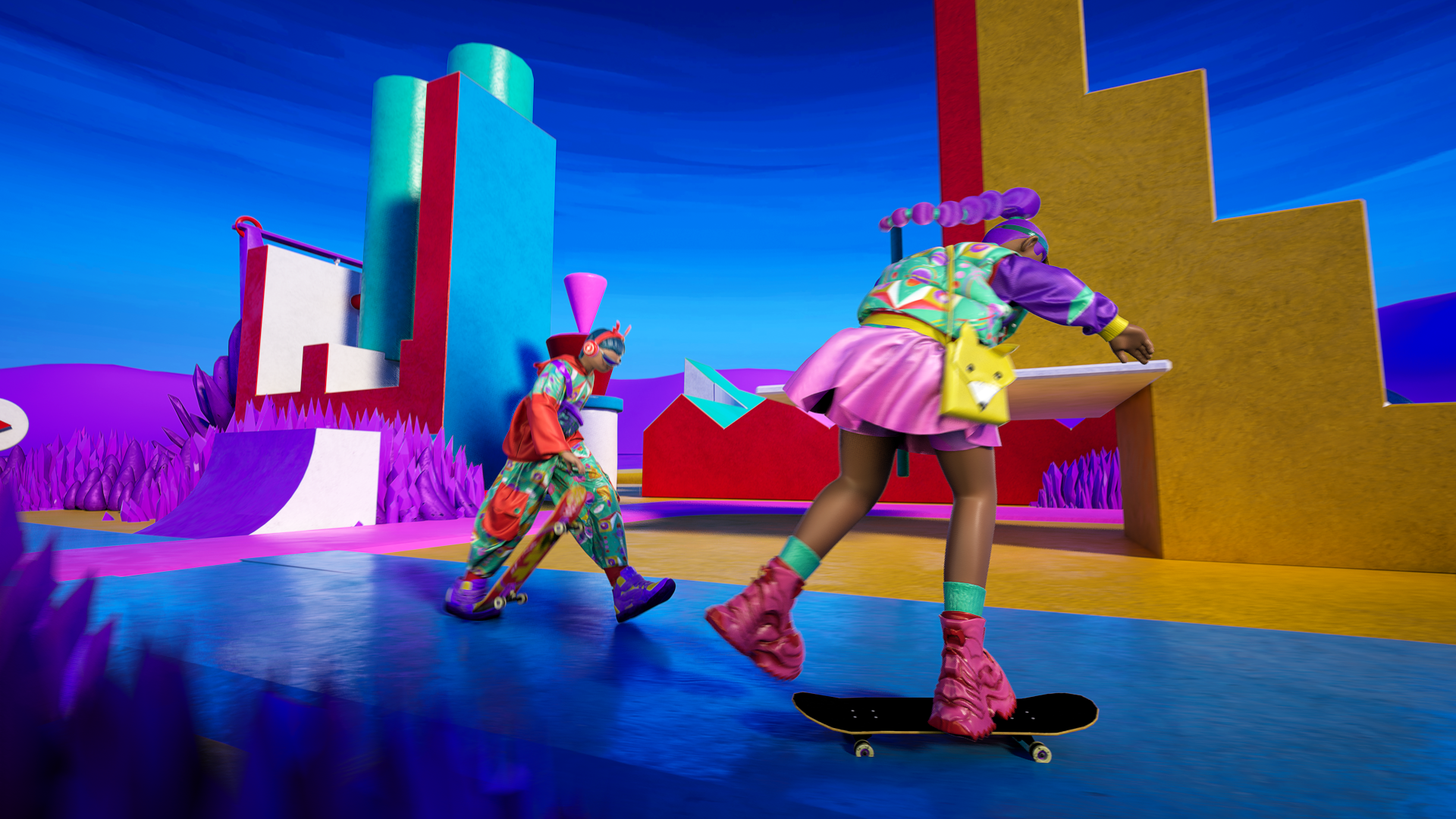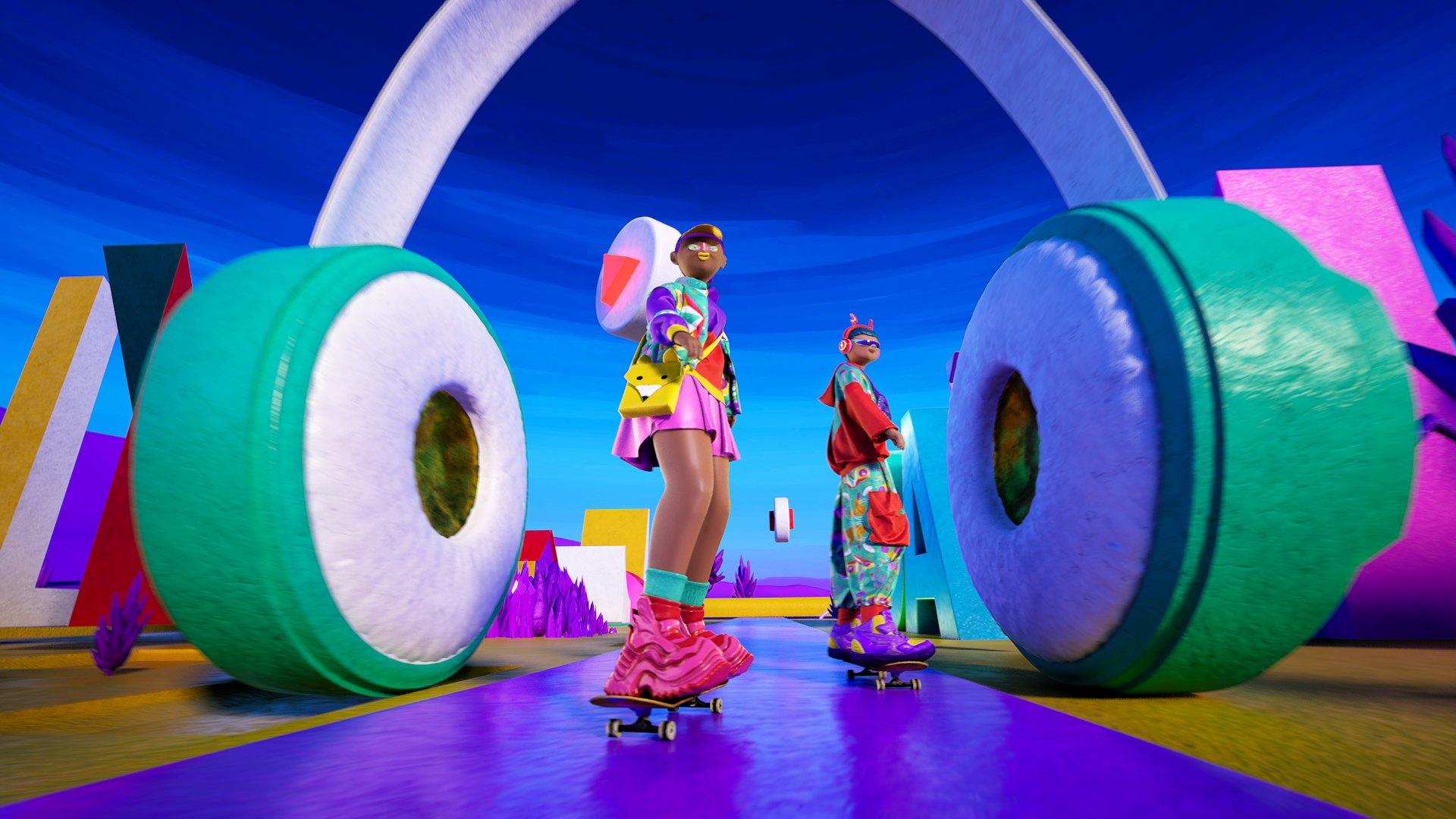 Radio Skaters is a vibrant 3D-animated TV ident that follows two charismatic characters racing through a fantastic circuit on their skateboards. The camera flows with them in energetic, action-packed shots as they interact with each other and a world filled with visual references to the radio universe.